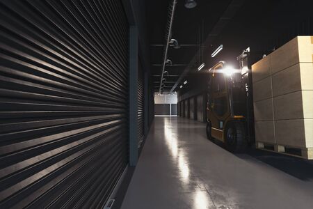 Forklift transporting cargo at warehouse. Forklift loader at storehouse. Pallet stacker truck equipment. 3d rendering.