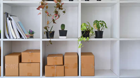 Cardboard boxes at warehouse. Online selling, e-commerce and shipping concept