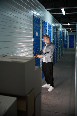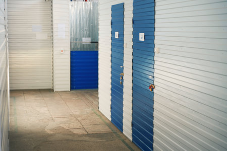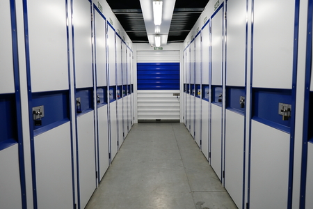 View of self storage warehouse, process of keeping and storing the goods and items in storage units, self-storage building, lock and key concept