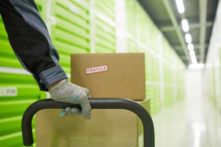 Close-up of man in gloves carrying trolley with parcels in warehouse