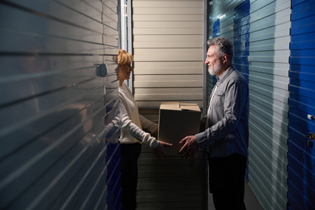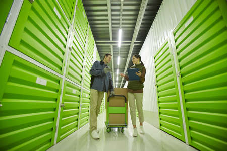 Young couple with big cardboard boxes into warehouse with self storage unit