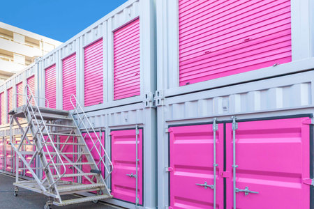Things storage in the self-storage units. Containers near the doors of personal storage rooms. Boxes near rented storage rooms. Renting out self-storage facilities. Warehouse business. 3d image