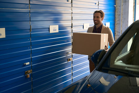 Young adult Caucasian man carrying cardboard box into storage unit, standing sideways and smiling, holding package with both hands, metal walls and open door visible in background