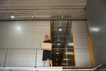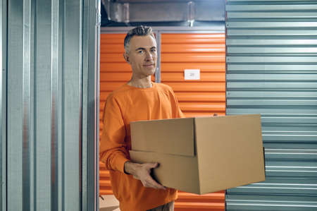 Waist up portrait of handsome man holding cardboard box standing in self storage facility and looking at camera, copy space