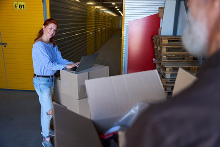Full length portrait of modern couple using digital tablet while loading boxes into self storage container, copy space