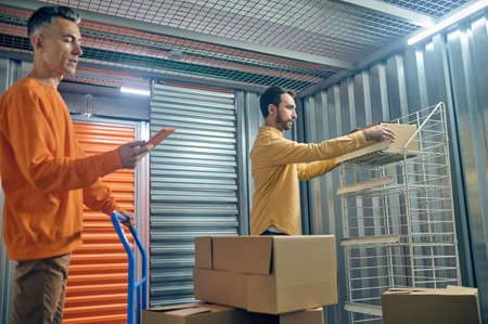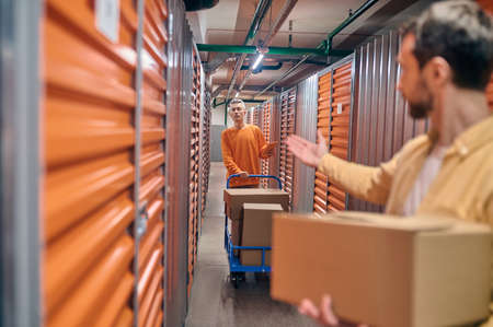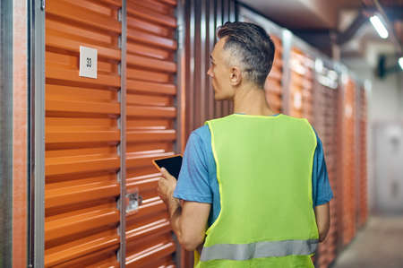 Side view of young guy in work clothes into warehouse with self-storage unit