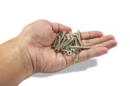 Hand holding silver metal screws on a background of various gray screws. The choice of screws in the store.