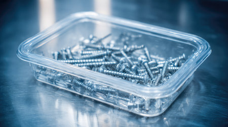 A transparent container holds a collection of shiny metal screws, ideal for industrial, DIY, or home improvement projects, highlighting organization.