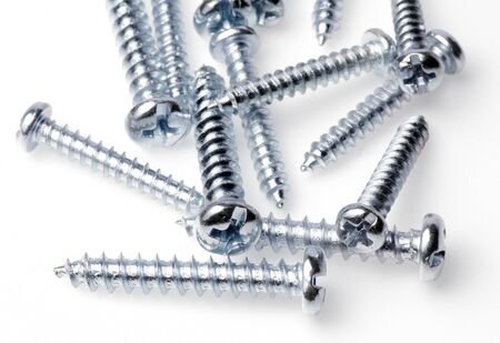 Self tapping metal screw isolated on white background. Macro shot of a self-tapping screws. Background of the screw. Self drilling fasteners. Steel bolts pattern. Tools for work