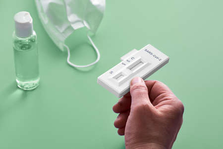 Rapid COVID-19 test for detection of specific antibodies IgM and IgG to novel corona virus SARS-CoV-2 causing Covid-19 illness. Closeup on hand holding test, green background with mask ,sanitizer.