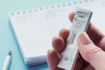 Hand holding Rapid Antigen Test kit with negative result swab COVID-19 testing.