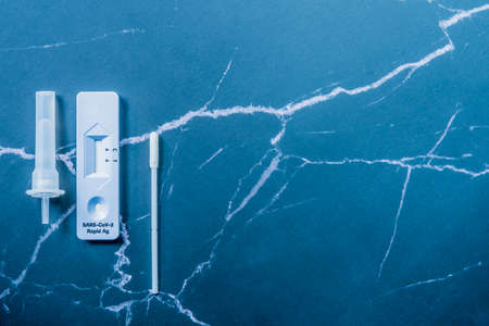 Rapid kits of Covid-19 Ag test seen on blue background.