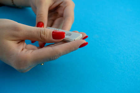 disposable pregnancy test strip. girl with red manicure makes a test to determine pregnancy. home diagnostics, in anticipation of the child. gynecological test.