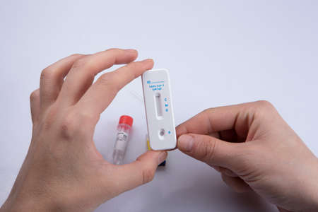 He was lucky and the test was negative. A young woman doing the rapid antigen test at her home, sars-cov-2, coronavirus, covid-19
