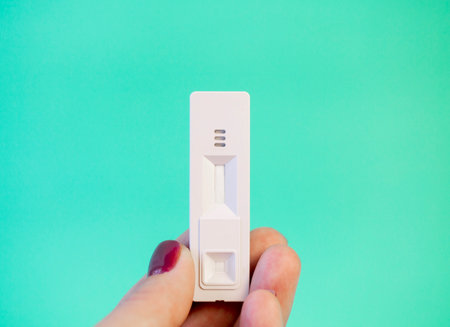 Anonymous hand is holding covid-19 coronavirus rapid antigen test kit with positive result