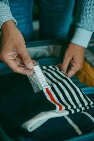 closeup of a young caucasian man packing a covid-19 antigen diagnostic test kit in his suitcase, packed with different clothes, on the bed