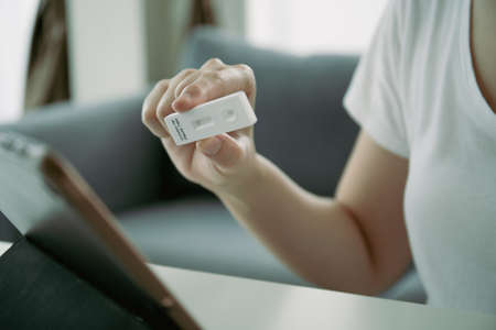 Asian young woman with hygiene protective face mask using SARS 2019-nCoV COVID-19 coronavirus antigen rapid test kit - ag test kit at home and consulting a testing result with doctor via video call.
