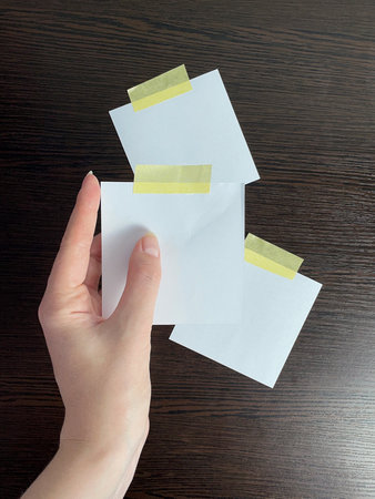 A person's hand holds white square sticky notes. Yellow tape sticks the notes to a dark brown wooden table. Other blank notes with tape appear in the background.