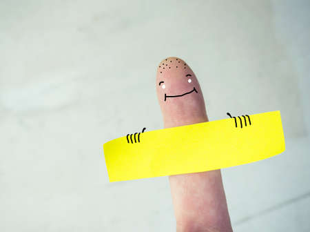The man shows his hand a thumbs-up gesture. The first phalanx of his little finger is wrapped in white ribbon. A smiling face is painted on the bandage. positive emotion concept. selective focus.
