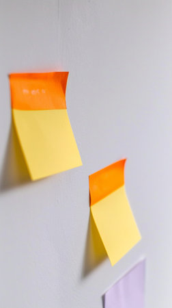 Bright orange and yellow sticky notes stuck on a textured white wall, creating a simple and colorful background.