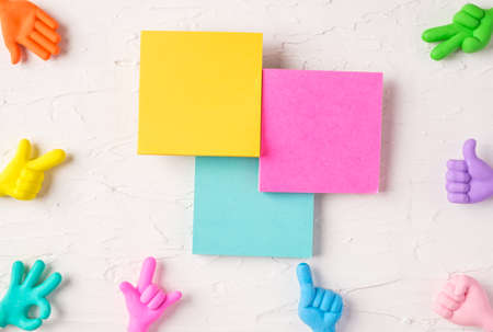 group of toy hand gesture on pencil and sticky note pad with white paster concrete background