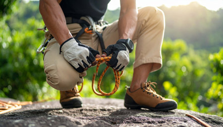 Close-up of climber with climbing equipment, tying knot on climbing harness, preparing for climbing.
