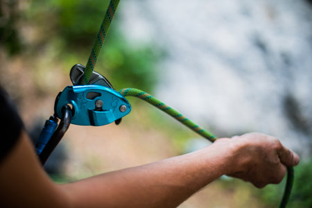 Close up shot of a man's hands operating a rock climbing assisted belaying device.