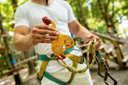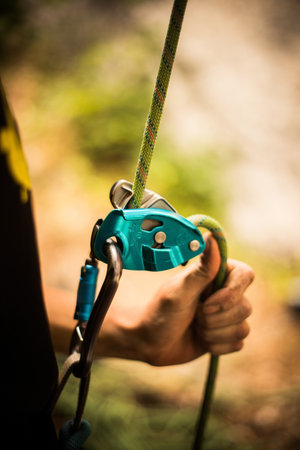 A close up view on the muscular arms of a rock climber, using hands to fix climbing rope to a safety harness. Professional sports gear with copy space