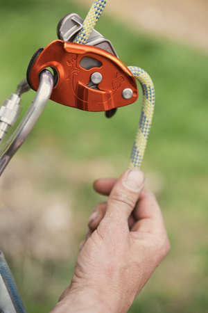 Close up shot of a man's hands operating a rock climbing belaying device.