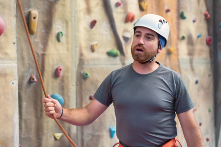 Male rock climber with climbing equipment holding rope ready to start climbing the route.