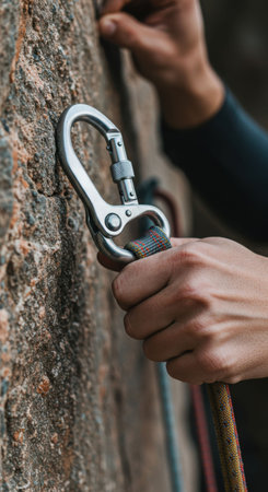 A male climber's hand holds a carabiner attached to a safety rope on a rock wall, symbolizing strength and adventure.