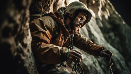 An experienced mountain climber preparing gear before an expedition, demonstrating years of expertise