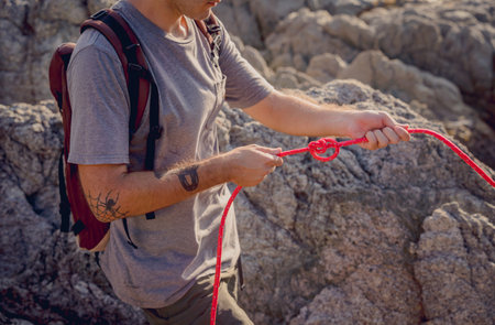 Rock climber tying knot on rope for climber man preparing climbing equipment