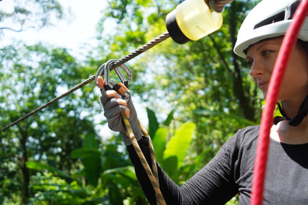 Woman is enjoying an exhilarating ride on a zip line that traverses the thick woods surrounding her