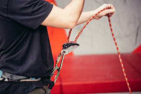 Close-up of sporty climber woman in safety harness belaying with rope and figure eight indoor.