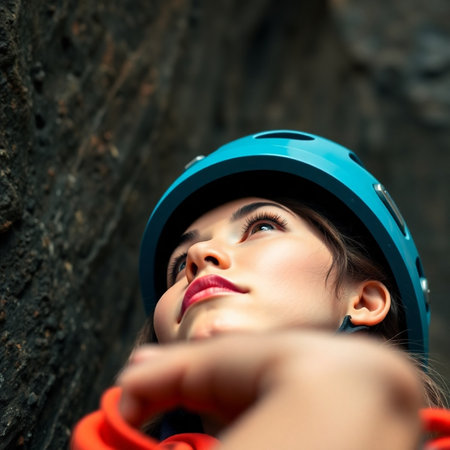 Determination shines as a climber secures a knot on a vibrant rope against a rugged rock face.