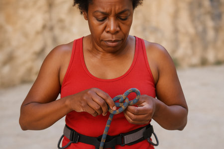 Focused mature woman in red tank top tying climbing knot outdoors, preparing for adventure against rocky terrain background.