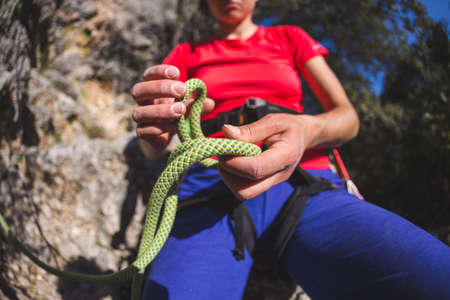 Unrecognizable sporty woman in safety harness holding climbing and mountaineering rope knot eight, close-up.