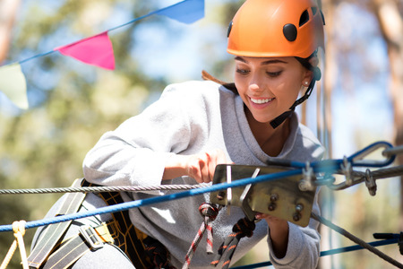 High above the ground. Pretty cheerful young woman holding a mountain carabiner and looking at it while being on the ropeway