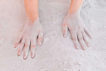 A person mixes cement and water in a container to get the finished mixture. The construction process, one of the stages of decoration. Making gypsum. Close-up.