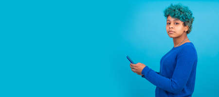 Cropped portrait of man holding phone with disappointed facial expression isolated over blue background in neon lights. Flyer