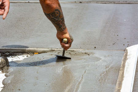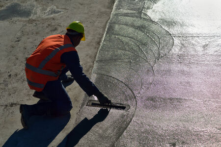 Construction man working with cement floor finishing - fresh concrete work with construction hand tool concept