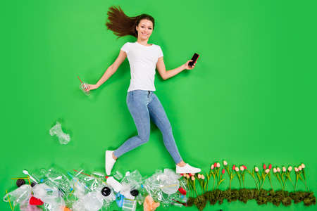 Full size high angle flat lay photo irresponsible citizen lady throw plastic products littering street earth pollution step on flowers mind only telephone isolated green color background