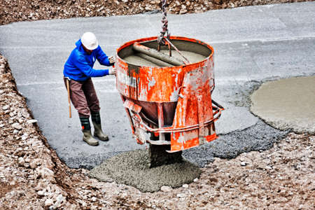 Italy March 2013 : Carpenter at work on site performs pouring of concrete for the foundation