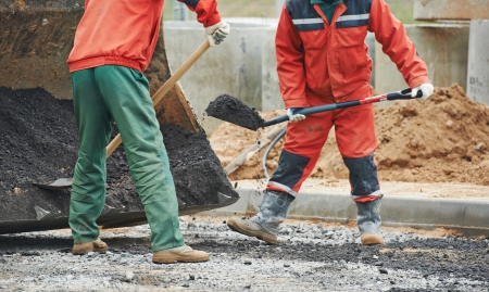Workers smoothing out asphalt pavement at the end of the run for a new road and intersection project