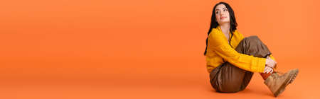 panoramic crop of brunette young woman in autumn outfit and boots looking away while sitting isolated on orange