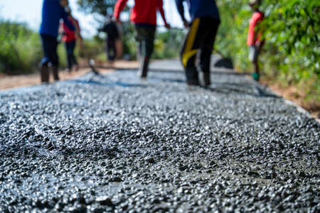 Construction Worker Leveling Wet Cement Into Wood Framing.