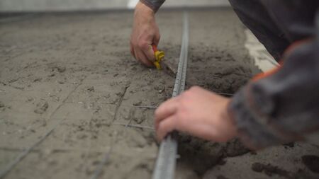 Leveling the floor screed with metal wire. Production of cement floor. Floor screed in the apartment.