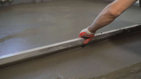 Close up of man builder placing screed rail on the floor covered with sand-cement mix at construction site. Male worker leveling surface with straight edge while screeding floor. Blurred background