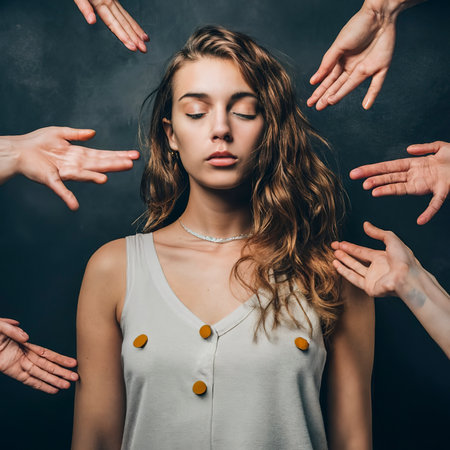 A young female model surrounded by male hands like her own thoughts or problems on dark wall